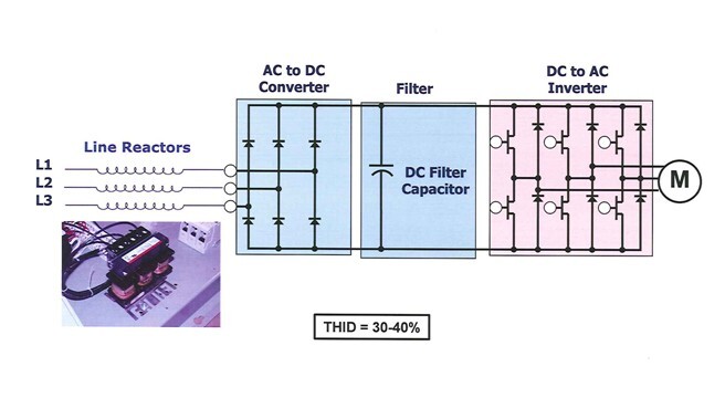 (Figure 4) Schematic of a VFD with a line reactor installed; the utility power comes in from the left of the schematic and goes out tot he motor on the right