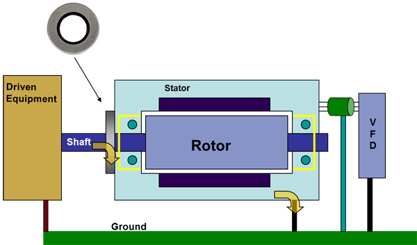 Motors that are operated with a variable frequency drive (VFD) are more susceptible to bearing failure. In standard generated sine waves, the voltage is balanced; this means that the amplitudes of the wave form on both the positive and negative sides are equal. In PWM (pulse wave modulated) generated sine waves, produced by VFD's, the voltages are not balanced. This unbalance can cause voltage potential in the motor structure, leading to voltage passing between the rotor and stator to ground through the motor bearings causing damage such as: